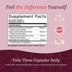 Premium blend of organic, Peruvian red, yellow and black Maca Root