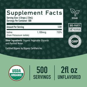 Iodine is an essential mineral that most people do not get enough of through diet alone.* Our Nascent Iodine Liquid Drops are USDA Certified Organic and formulated to be the most effective iodine supplement with 1100mcg per serving. Adequate iodine intake assists with thyroid function to support hormone balance, energy, metabolism, detoxification, immune support, and more. Liquid supplements are more readily absorbed by the body than any other type. Our Nascent Iodine formula is the most highly utilized form of Iodine available, combined with Purified Water and Organic Vegetable Glycerin for maximum efficacy and a milder taste. Each 2 fl. oz. bottle contains 500 servings – over 1-year of iodine drops! Our glycerin-based formula and amber glass bottle help ensure potent servings and a long shelf life. Nascent Iodine Liquid Drops are Certified USDA Organic, formulated Non-GMO, Vegan, and Third-Party Tested. They are manufactured in a facility that adheres to good manufacturing practices.